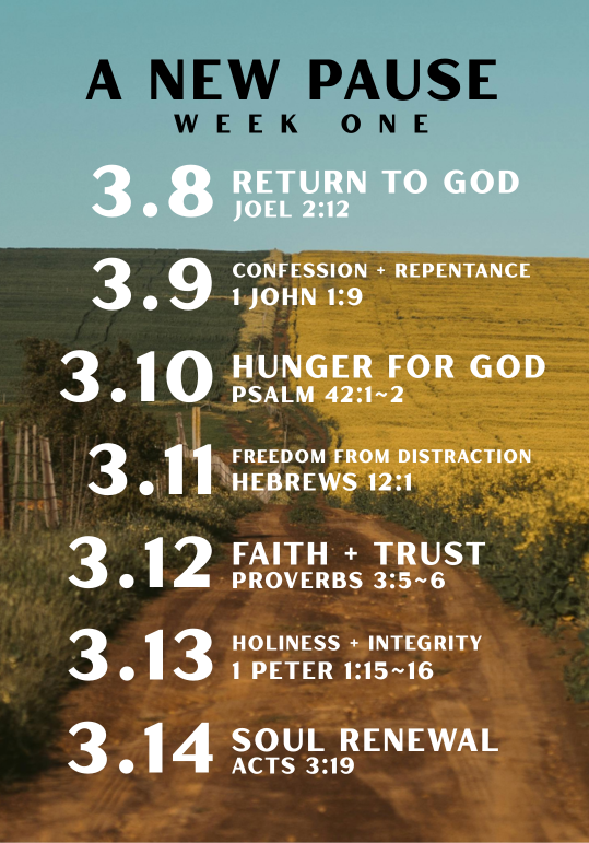 A New Pause: A 28-Day Prayer Journey is an invitation to slow down and meet God right where you are. For 28 days, Starting March 8th and ending Easter Sunday ~ weāre inviting our church and community to pause each day and pray, at home, in your car, during a quiet moment, or in the middle of a busy day.