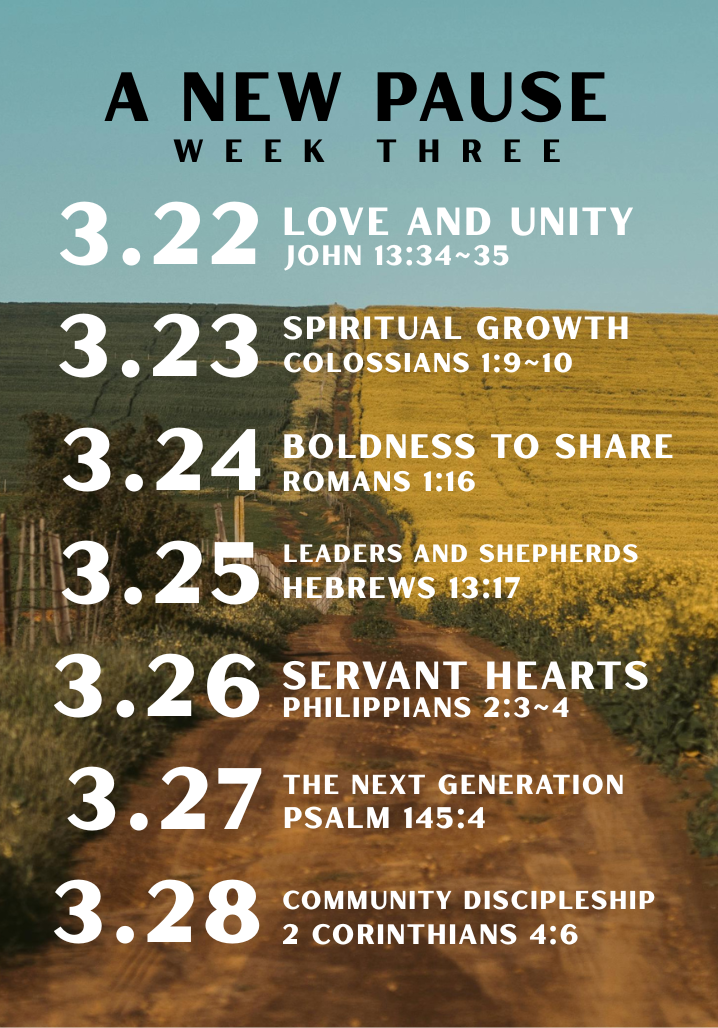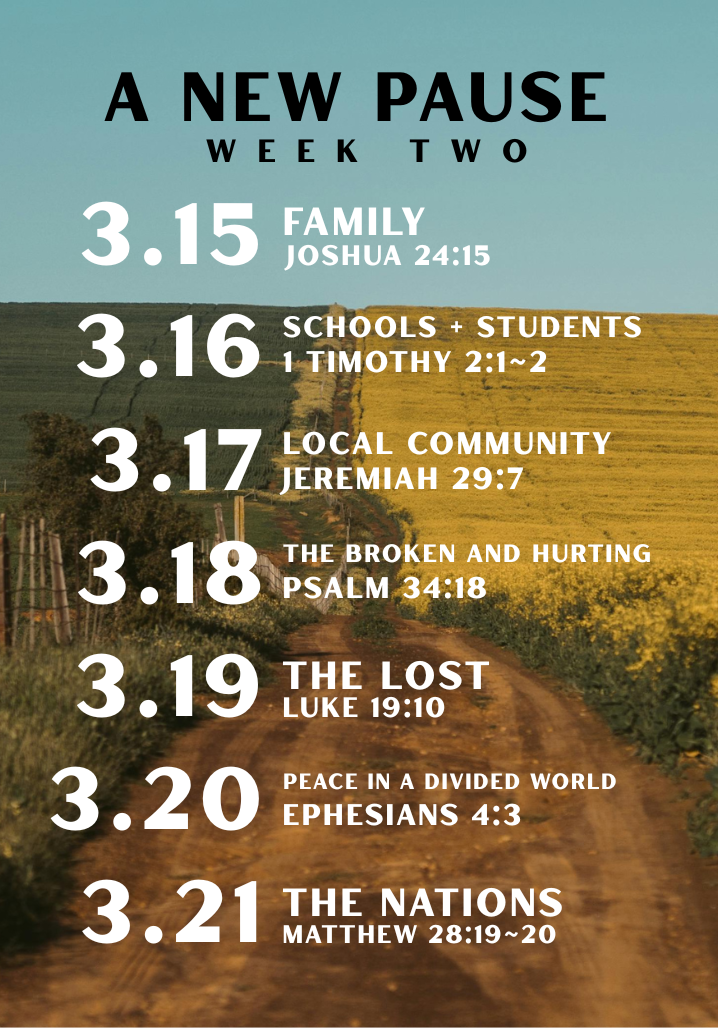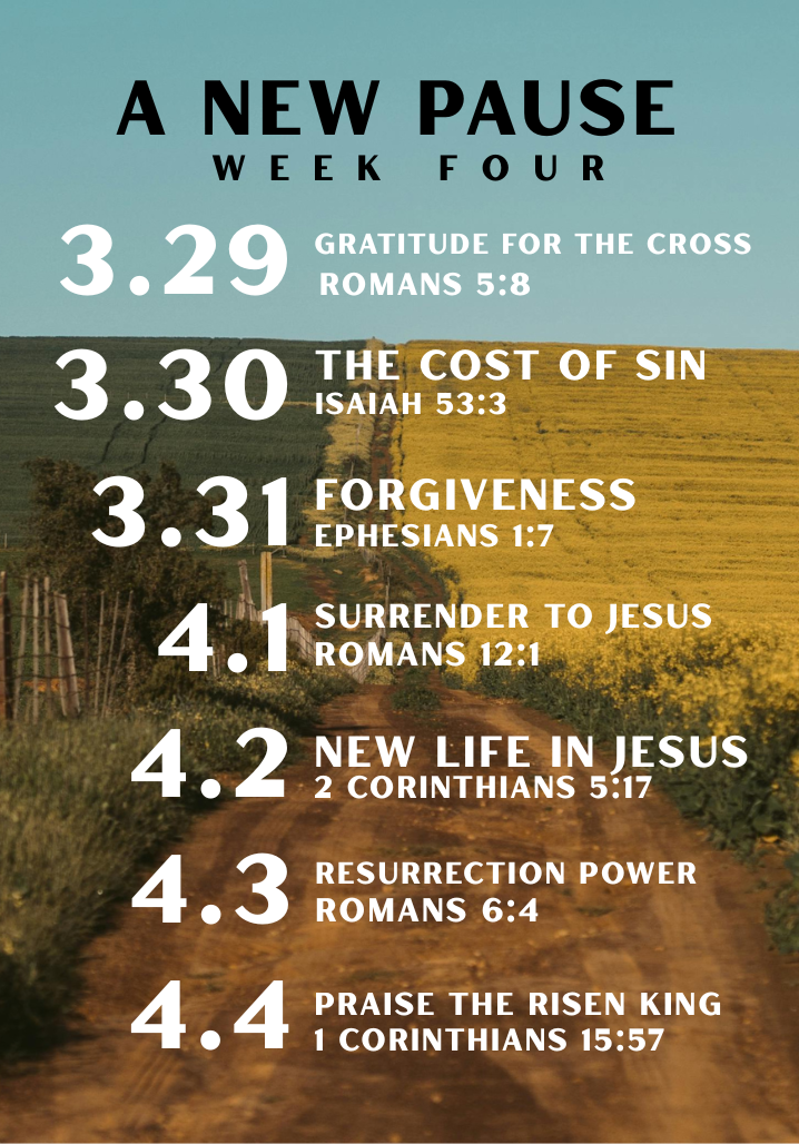 A New Pause: A 28-Day Prayer Journey is an invitation to slow down and meet God right where you are. For 28 days, Starting March 8th and ending Easter Sunday ~ weāre inviting our church and community to pause each day and pray, at home, in your car, during a quiet moment, or in the middle of a busy day.